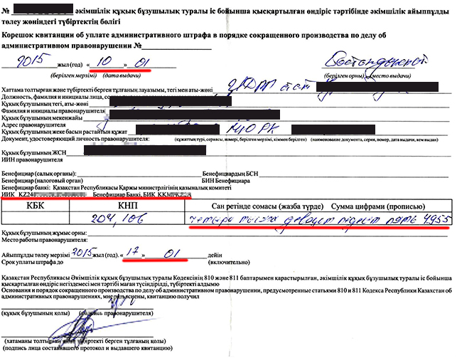 При этом, чтобы нарушителю выдали «скидочный» квиток, водитель должен признать свою вину. Если же он не согласен с нарушением, ему попросту выпишут стандартный протокол на полную сумму штрафа. К слову, на «скидочной» квитанции указывается крайний срок уплаты штрафа (через семь дней) и уменьшенная сумма. К примеру, если штраф составил 5 МРП (9 910 тенге), в квитанции будет значиться ровно половина, то есть 4 955 тенге. Именно эту сумму и необходимо уплатить.