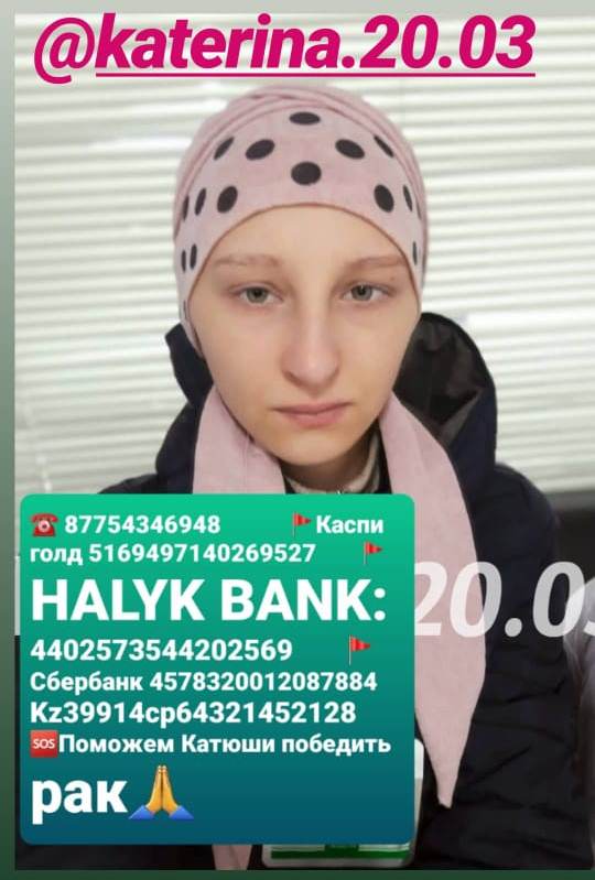 Катерине Михель 16 лет. Год назад врачи диагностировали у Кати герминогенноклеточную опухоль правого яичника. С тех пор девочка активно борется с раком. Сейчас она с матерью находится на реабилитации в Алматы, но у семьи трудное финансовое положение: работает только глава семейства.