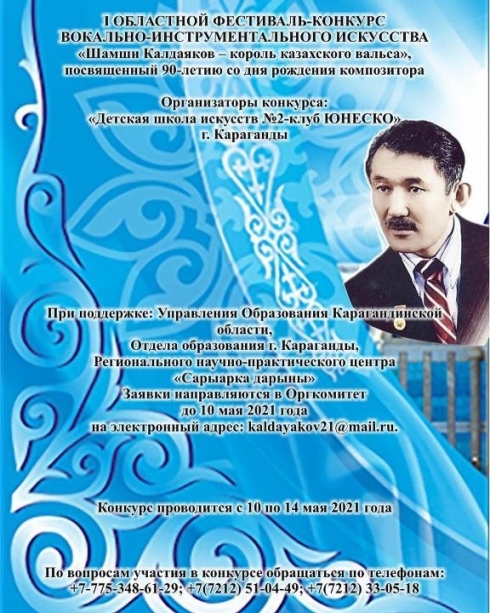 Карагандинская детская школа искусств №2 объявляет о проведении I областного фестиваля-конкурса вокально-инструментального искусства «Шамши Калдаяков – король казахского вальса».