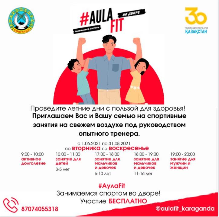 Жители Караганды приглашаются на бесплатные спортивные занятия на свежем воздухе под руководством опытных тренеров. Отдел развития языков, физической культуры и спорта города запустил в пилотном режиме проект Aulafit. Его реализацией в рамках государственного социального заказа занимается общественный фонд «Фракция молодёжи Казахстана».