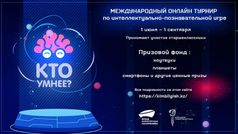 Фонд Нурсултана Назарбаева и Фонд развития государственного языка объявляют о старте ежегодного Международного онлайн-турнира по интеллектуально-познавательной игре «Кто умнее?». Её участниками могут стать школьники 9, 10 и 11-х классов из Казахстана и зарубежья.