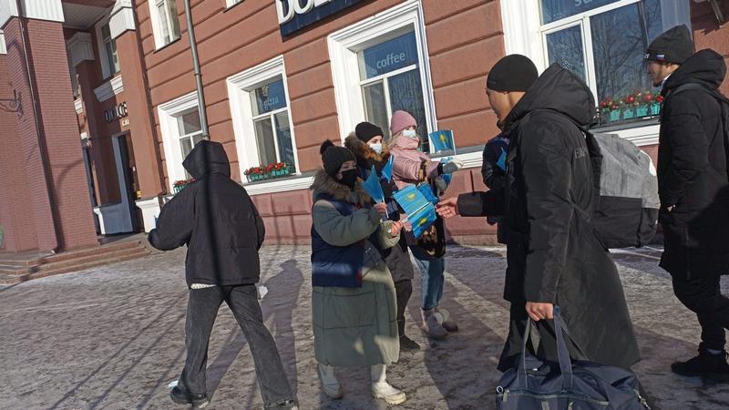 В центре шахтёрской столицы, на балконах гостиницы «Караганда», вывесили государственные флаги. С предстоящими праздниками горожан поздравила активная молодёжь города. Волонтёры раздавали карагандинцам флажки и магниты.