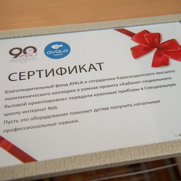 «В декабре 2020 года студенты Карагандинского высшего политехнического колледжа впервые стали волонтёрами на проекте по оказанию адресной социальной помощи малообеспеченным семьям области. Потом вместе с ними у нас была раздача продуктовых наборов в марте 2021 года. А в декабре этого года руководство колледжа вышло на нас с отличной инициативой студентов двух отделений. Они, вдохновившись нашим проектом «Профориентация», решили собрать средства и купить кухонный инвентарь для проведения кулинарных занятий в Специальной школе-интернате № 6 города Караганды», – рассказали сотрудники фонда AYALA на своей странице в Facebook.