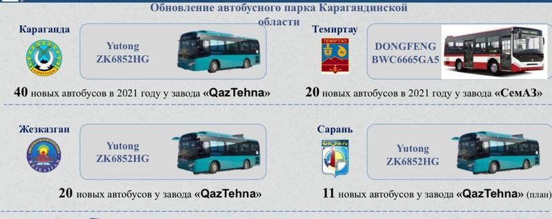 По сведениям управления пассажирского транспорта и автомобильных дорог, в 2021 году в Караганде на маршруты запустили 40 новых автобусов отечественного производства, в Темиртау – 20, в Жезказгане – 20, в Сарани – 11.
