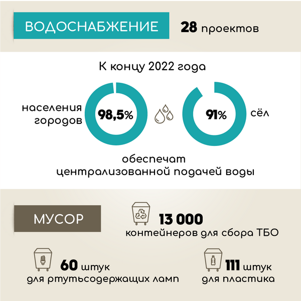 По итогам года мы планируем обеспечить доступом к услугам водоснабжения 98,5% населения городов и 91% сёл. К 2025 году мы должны охватить питьевой водой 100% населения Карагандинской области.
