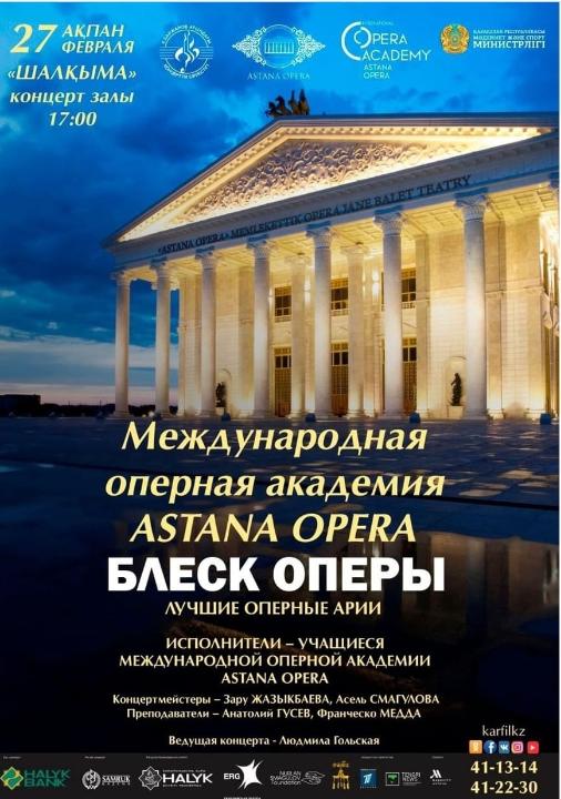 В концертном зале «Шалқыма» 27 февраля состоится гастрольное выступление учащихся Международной оперной академии ASTANA OPERA. Слушателям будет представлена программа под названием «Блеск оперы», составленная из всеми любимых арий в сопровождении фортепиано, сообщает сайт акимата Карагандинской области.