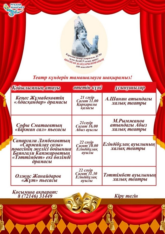 – Дни народных театров приурочены к 100-летию великой актрисы театра и кино, педагога Шолпан Жандарбековой. Так как она уроженка нашего района, награждение победителей областного конкурса народных театров состоится у нас. Также лучшие участники творческого соревнования представят свои постановки на нашей сцене. Мы приглашаем жителей насладиться театральным искусством и актёрским мастерством земляков. Вход на все показы бесплатный, – добавила Жазира Искакова.