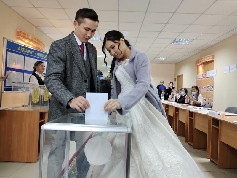 Сделать свой выбор сразу после регистрации в РАГСе решили молодожёны Алтынбек Карибай и Гульбаршин Алимханова. Они уверены, что от их голосов тоже зависит будущее страны. Супруги проголосовали на избирательном участке № 82.