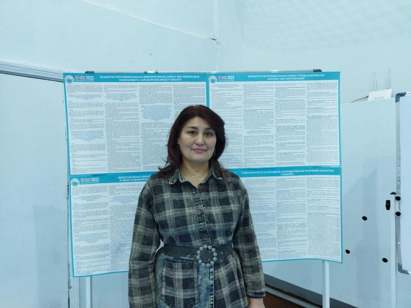 Наблюдатель от партии Amanat Алмагуль Сакимбаева следит за выборами на участке для голосования № 11, расположенном в гимназии имени Каныша Сатпаева.