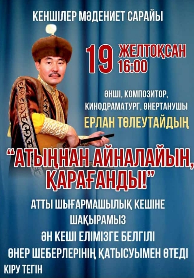 Во Дворце культуры горняков Караганды 19 декабря в 16:00 состоится творческий вечер певца, композитора, кинодраматурга, искусствоведа Ерлана Төлеутая «Атыңнан айналайын, Қарағанды!», сообщает сайт акимата Карагандинской области.