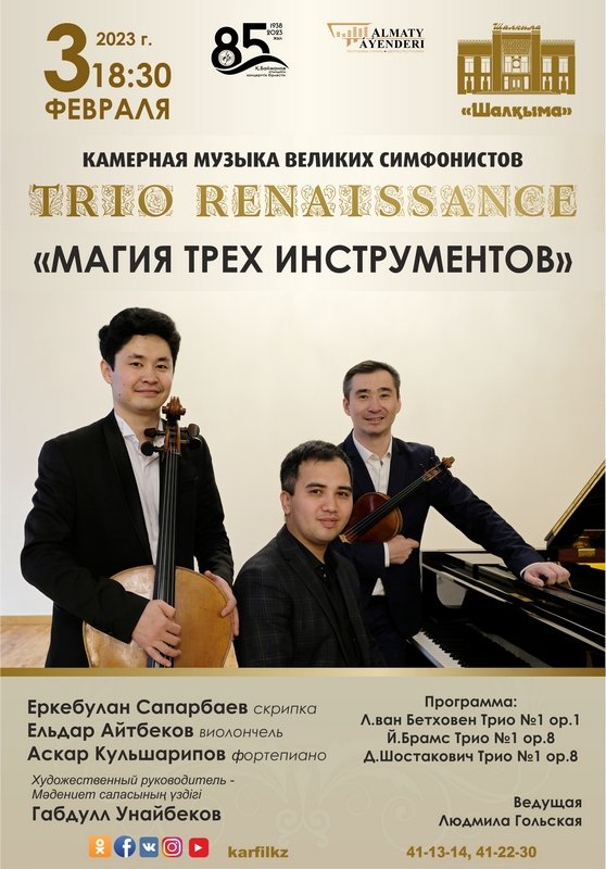 Карагандинцев и гостей города 3 февраля в 18:30 приглашают в к/з «Шалкыма» на концерт Trio Renaissance «Магия трёх инструментов», передает сайт акимата Карагандинской области.