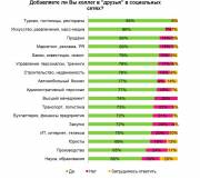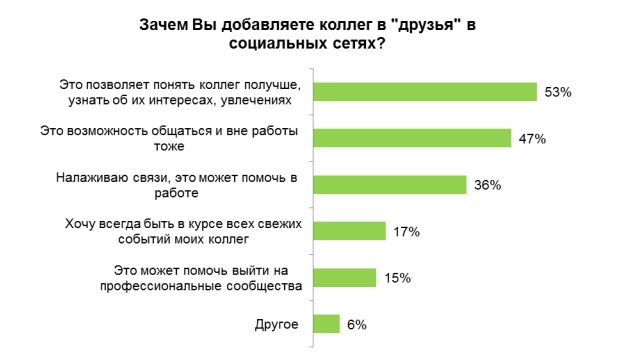 Служба исследований HeadHunter провела опрос среди работников, зарегистрированных в социальных сетях, и выяснила, что 75% из них добавляют коллег в список «друзей»! Респонденты объясняют это тем, что хотят поближе узнать об интересах и увлечениях людей, с которыми они контактируют по деловым вопросам каждый день, а 47% таким образом поддерживают приятельские отношения, поскольку соцсети помогают оставаться на связи и после работы, и по выходным.
