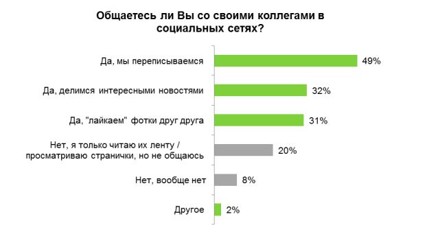 Примерно четверть работников, которые добавляют коллег в «друзья» в социальных сетях, не общаются с ними в принципе! 20% просто просматривают странички или читают новостную ленту, а 8% не интересуются даже этим. В то же время почти половина опрошенных переписывается с коллегами, треть делится интересными новостями, а еще столько же «лайкает» фотографии.