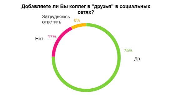 Стоит отметить, что «дружба» в социальных сетях не дает гарантии реальных близких отношений в будущем. Дело в том, что 8% опрошенных, добавив коллегу во «френды», тут же забывают об этом, а 20% хоть и просматривают личную информацию и читают новостную ленту, однако в контакт не вступают.