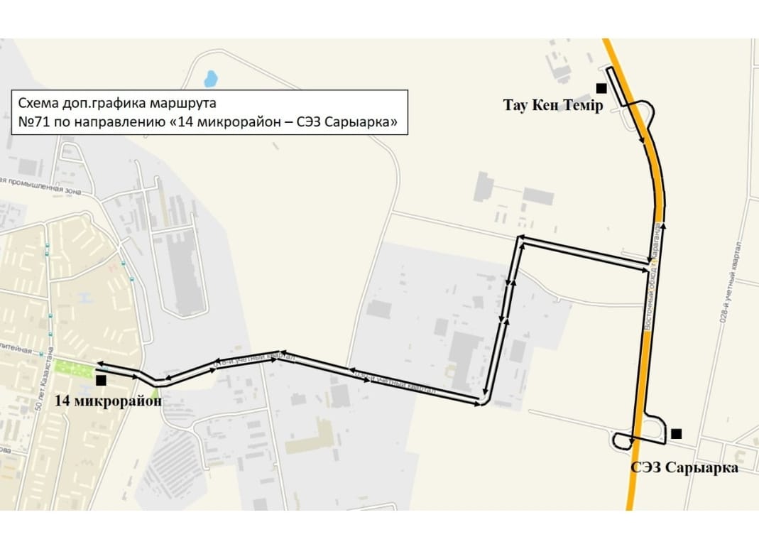 Как отмечают в ведомстве, один из имеющихся маршрутов № 71 будет курсировать от 14 микрорайона Майкудука по указанной схеме и расписанию с пометкой «71 маршрут СЭЗ».