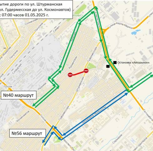 В автобусном парке № 3 поясняют, что движение автобусов маршрута № 40 будет осуществляться по улице Камской, а движение маршрута № 56 по улице Момышулы.
