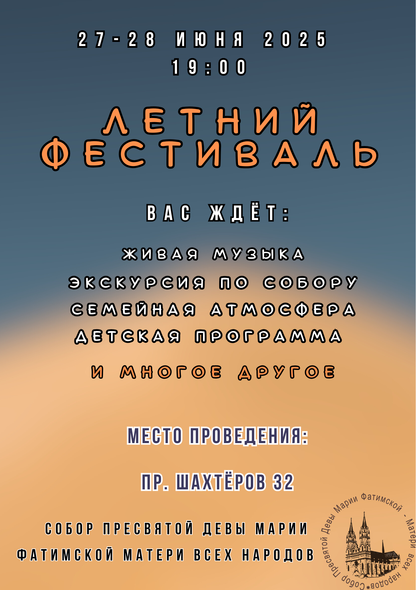 Летний фестиваль будет проходить на территории католического собора, на улице. В программе – живая музыка, флешмоб, сценки, экскурсии по зданию собора. Здесь будет предусмотрена отдельная программа для детей – с весёлыми стартами, паззлами и играми.