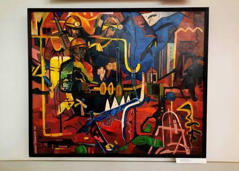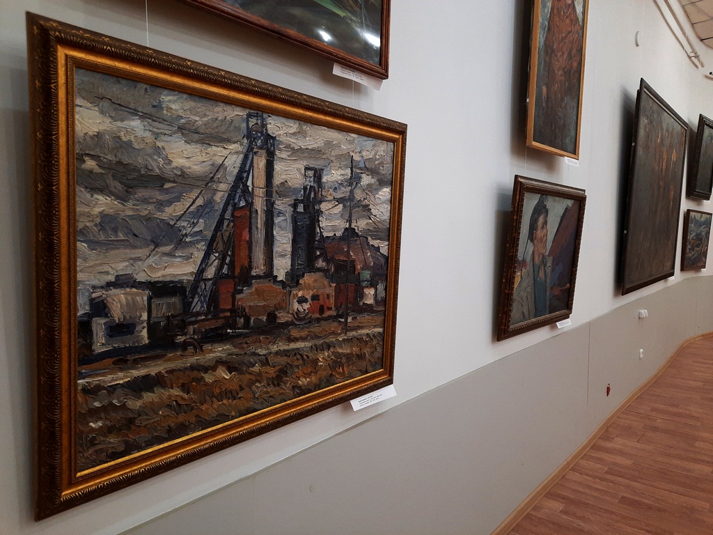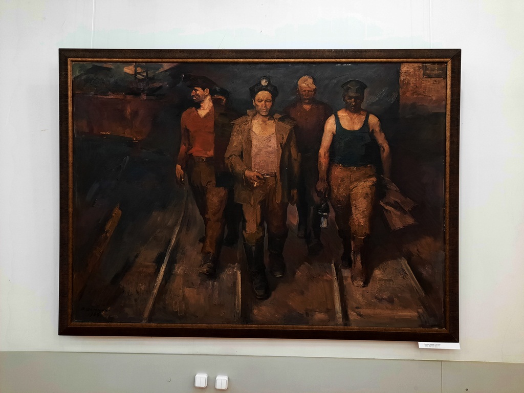 «Ещё одно из знаковых произведений выставки – полотно карагандинского художника Вениамина Шамшина "Уголь", созданное в 1965 году. Оно занимает центральное место выставки. На нём в полный рост изображены четверо горняков, которые после смены выходят из забоя. Заметно, что они только что вышли из забоя, уставшие, но довольные своей работой. Казахстанский художник Гилярий Гилевский мастерски отразил портрет Молодого шахтера. На холсте горняк одет в костюм, ощущается его положительная энергетика и сила воли», — рассказывает Дамели Данкеева.