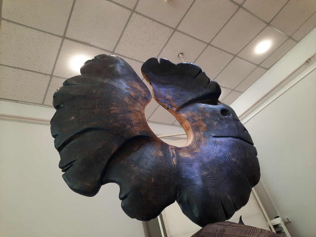 На афише выставки изображена работа скульптора «Океан» - масштабная рыба из дерева, окрашенная в оттенок морской волны. И здесь ассоциации автора уходят к древним образам подводных существ. А зритель, в свою очередь, увидит свои сюжеты, рассматривая детали скульптуры.