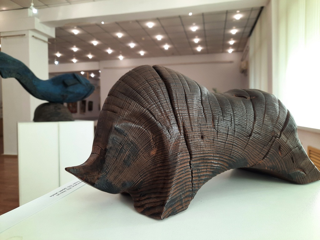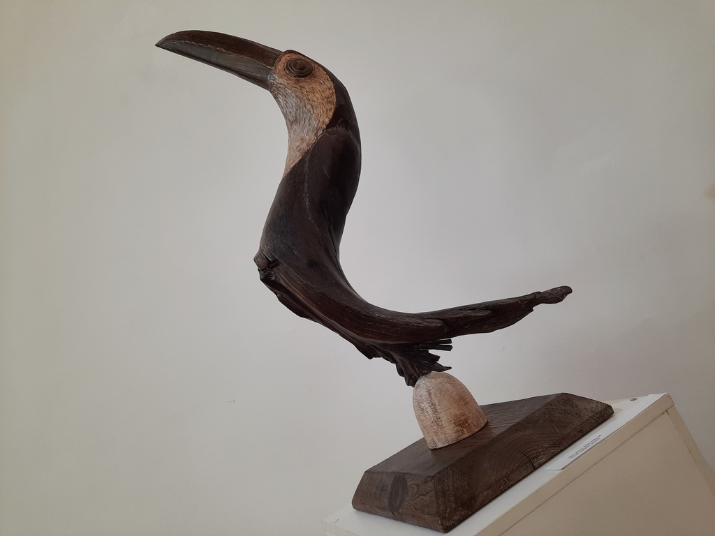 На экспозиции представлено немало скульптур рыб, а также других представителей животного мира – их в коллекции у Сергея Чеченова тоже достаточно. Изящного тукана из дерева автор, например, создавал впервые. Не менее изящны носороги, тело и голова которых плавно перетекают в рог – на выставке таких два.