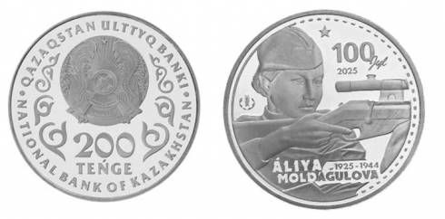 Как сообщили в Нацбанке, монета посвящена Алие Нурмухамбетовне Молдагуловой — Герою Советского Союза, участнице Великой Отечественной Войны. В дизайне монеты использовано портретное изображение героини.