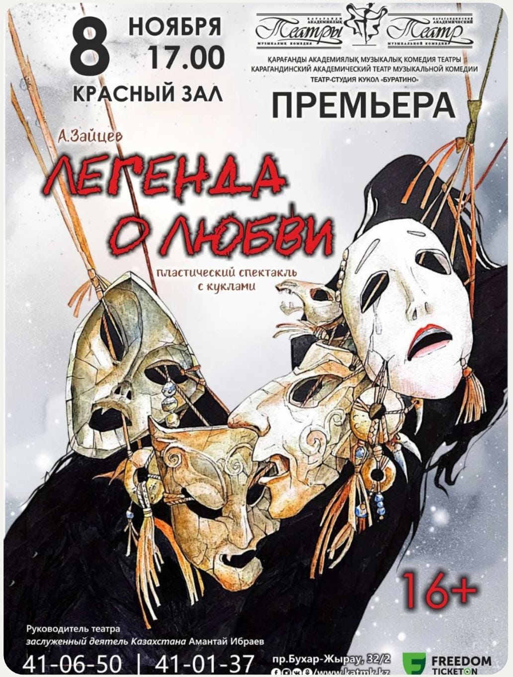 Уже в эту субботу, 8 ноября, в 17.00 в Карагандинском академическом театре музыкальной комедии (пр. Бухар жырау, 32/2) представят премьеру – пластический спектакль с куклами «Легенда о любви. Жезтырнак» и с рейтингом 16+, который определённо станет отступлением от привычных канонов. Спектакль создавали с участием приглашённых из других городов авторов. Корреспондент ekaraganda.kz подробнее узнала об его уникальных моментах.