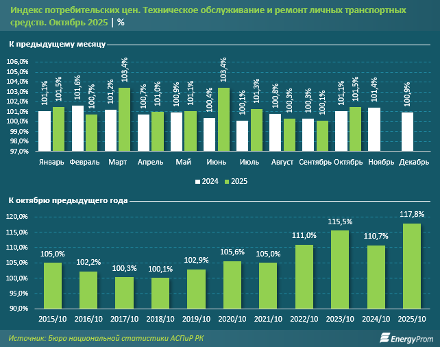 Фото: ekaraganda.kz Цены на услуги ТО и ремонта личных транспортных средств по итогам октября 2025-го увеличились на 1,5% за месяц, сообщает inbusiness.kz со ссылкой на Еnergyprom.kz.