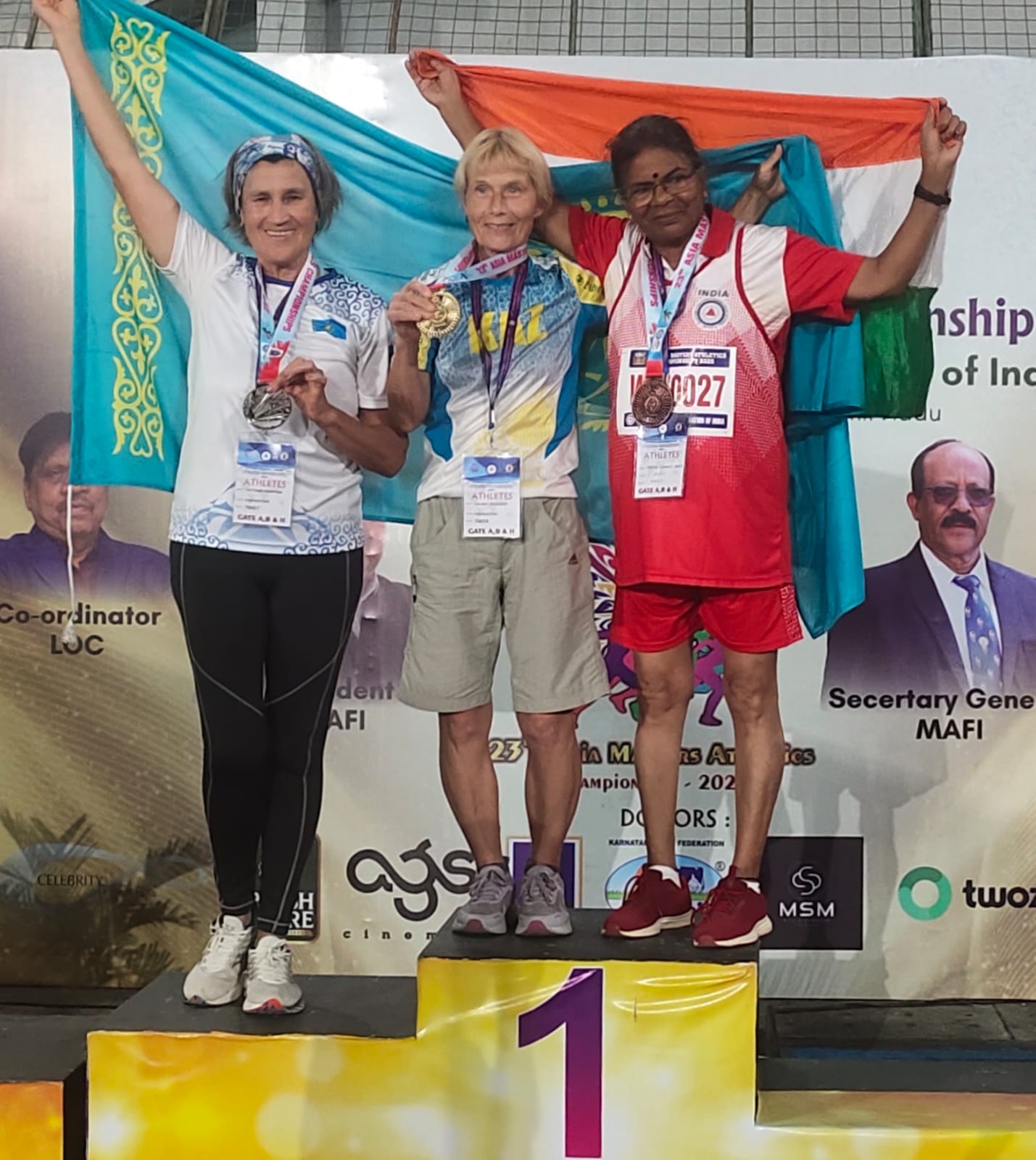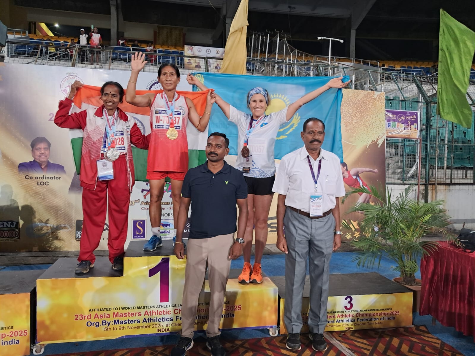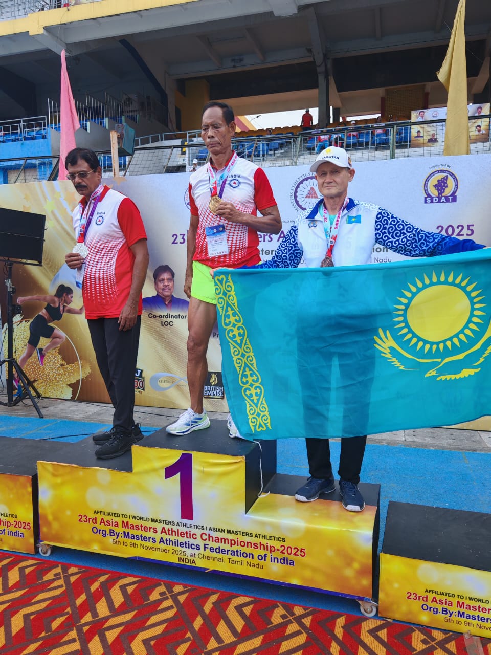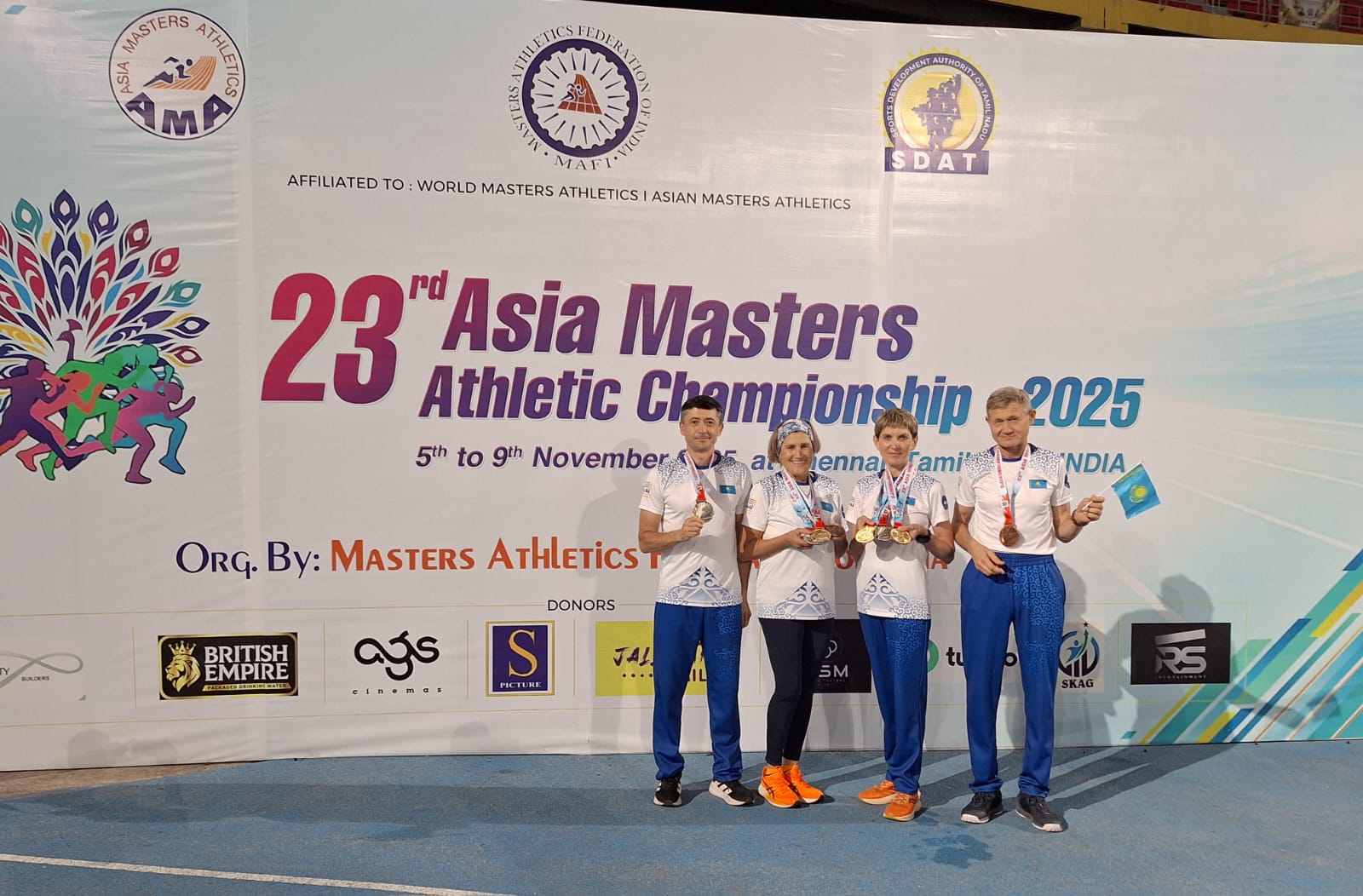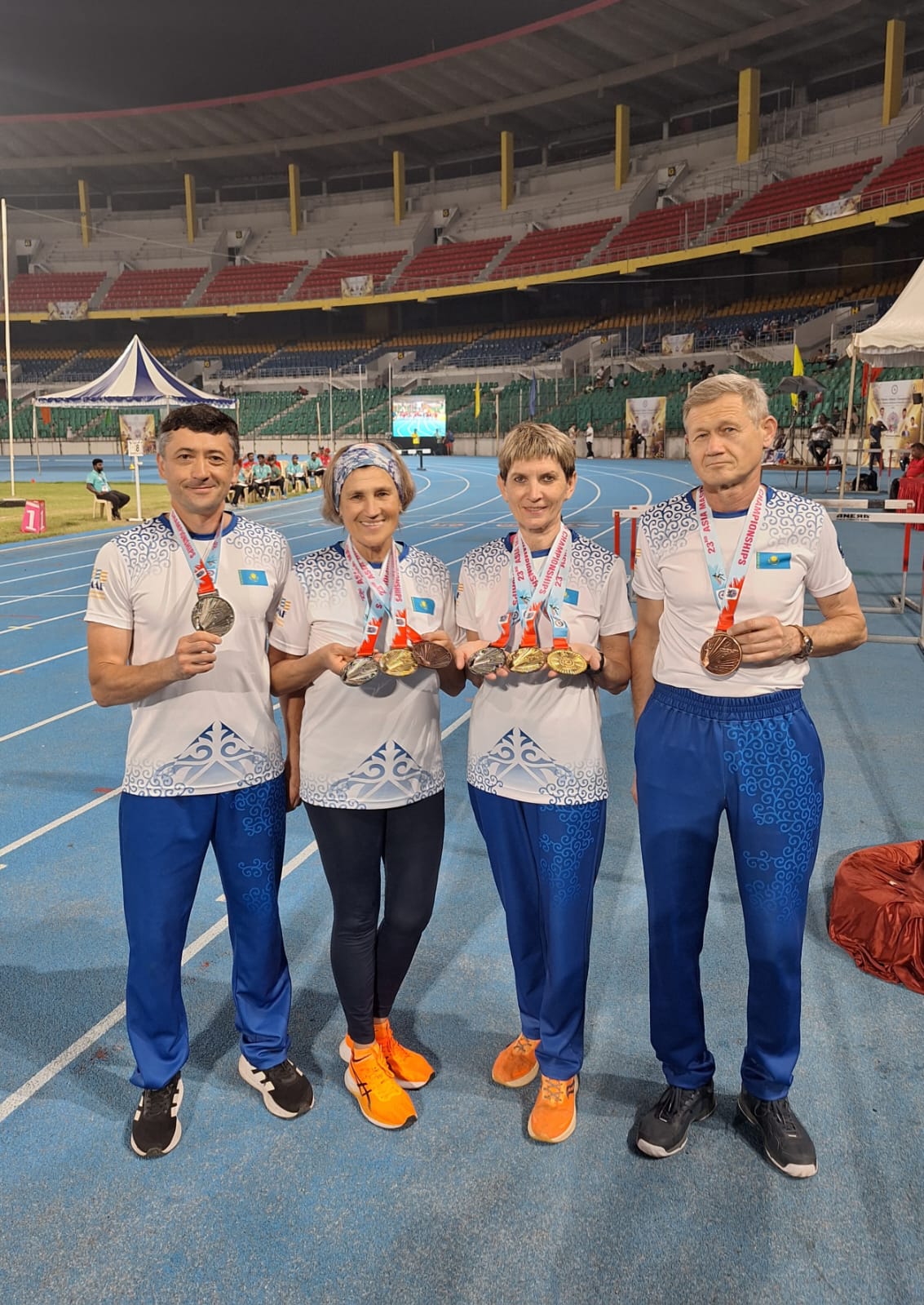 Фото: Жандос Ахметов В индийском городе Ченнай с 5 по 9 ноября прошел 23-й чемпионат Азии по легкой атлетике среди мастеров – спортсменов в возрасте от 35 лет и старше. Казахстан на соревнованиях представляли 38 спортсменов, среди них четверо из Карагандинской области. Несмотря на то, что поездка была организована за их личные средства, карагандинцы остались максимально довольны, так как все из них вернулись домой с медалями, передает корреспондент ekaraganda.kz.