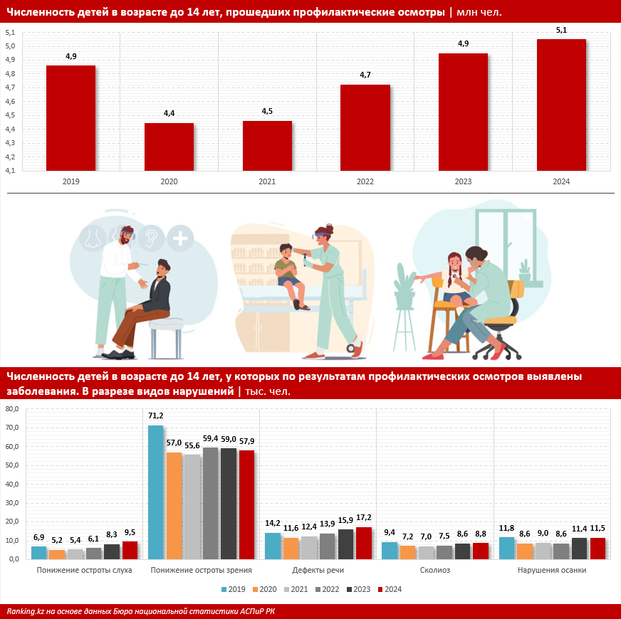 В стране становится больше детей, проходящих регулярные профилактические медосмотры, и вместе с этим растёт абсолютное число выявленных заболеваний. По данным Бюро национальной статистики, в 2024 году обследование в медучреждениях прошли 5,1 млн детей до 14 лет - это больше, чем в предыдущие годы, когда охват ежегодно увеличивался на 0,3-6%.