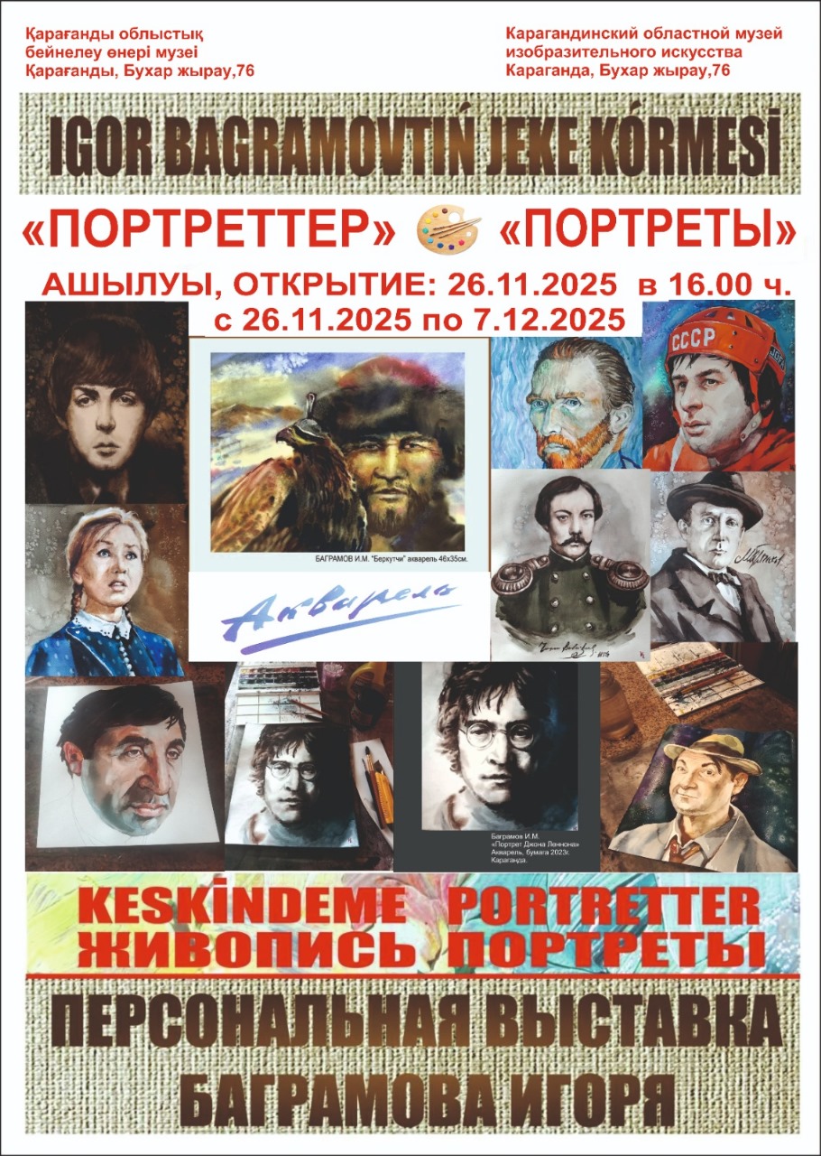Фото автора Персональная выставка работ Игоря Баграмова откроется в областном музее Изобразительного искусства (пр. Бухар жырау, 76) 26 ноября в 16.00. Экспозиция, которая продлится до 7 декабря, станет продолжением его прошлой выставки в 2023 году. И здесь зритель вновь увидит портреты известных и знакомых личностей – всего 150 картин, сообщает корреспондент ekaraganda.kz.