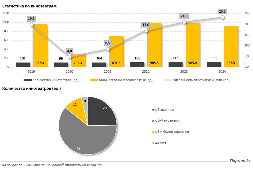 Анализ ключевых показателей активности кинотеатров показал, что интерес казахстанцев к просмотру фильмов в кинотеатрах продолжает расти. В 2024 году общая посещаемость достигла 23,3 млн человек, что на 10,9% превышает результат предыдущего года.