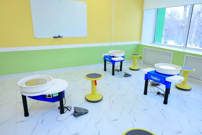 Работают сенсорная комната, музыкальный кабинет, гончарная, столярная и швейная мастерские.