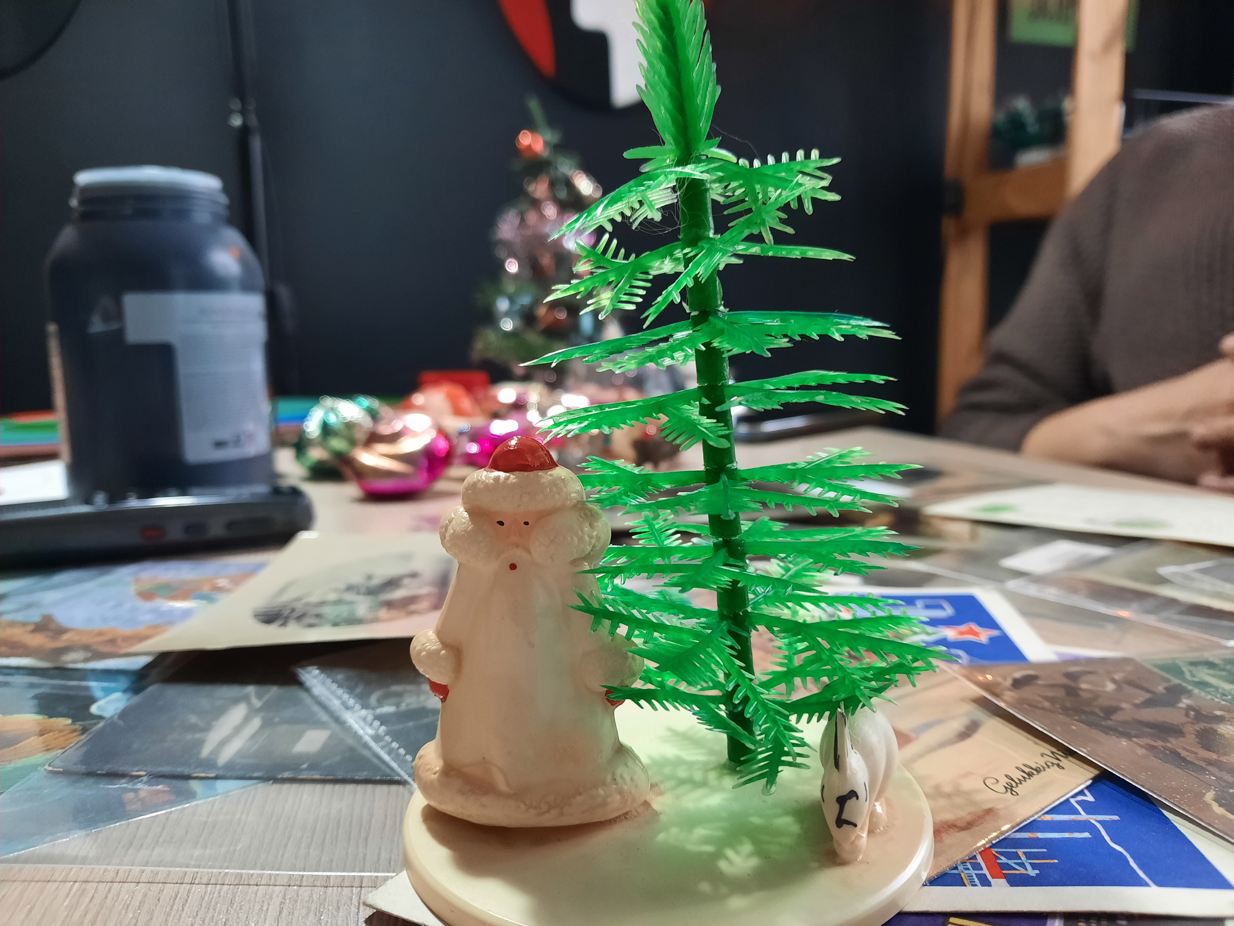 Кроме игрушек и открыток она хранит и небольшие советские ёлочки – а такие ставили почти в каждом доме. Есть Деды Морозы: из ваты, папье-маше, резины, пластика. Есть и Снегурочки, хотя их меньше. Ёлки же разных размеров, с игрушками и без. Есть и новогодний декор – например, кукольные санки, когда-то купленные в антикварном магазине в Караганде.