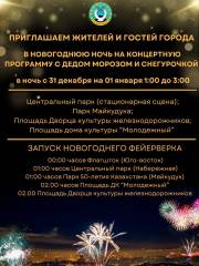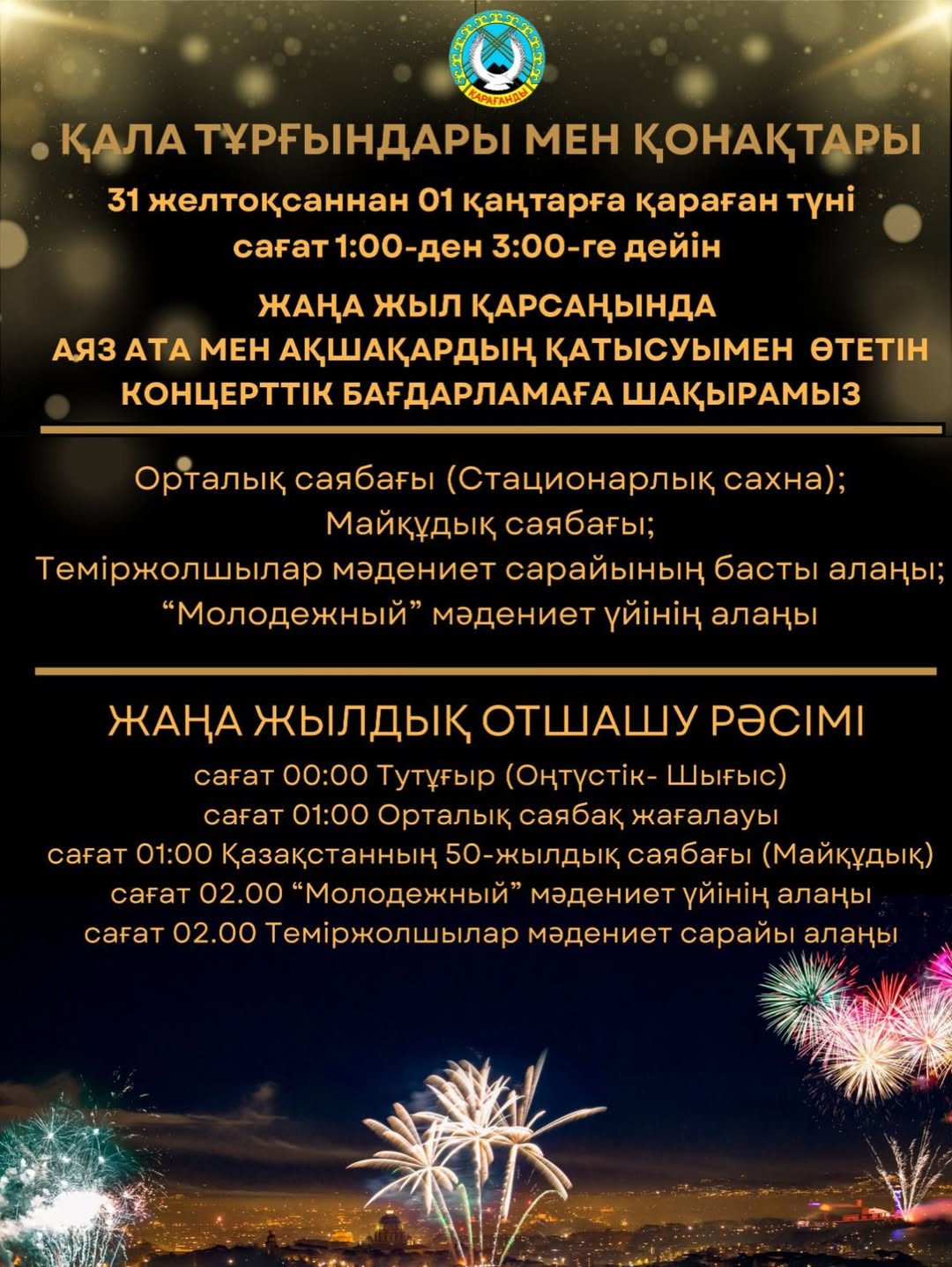 Карагандинцев приглашают провести это время вместе, насладиться праздником и прочувствовать волшебство новогодней ночи.