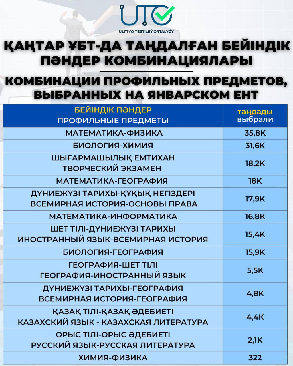Центр опубликовал информацию о самых популярных комбинациях профильных предметов на январском ЕНТ-2026.