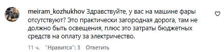 «Здравствуйте, у вас на машине фары отсутствуют? Это практически загородная дорога, там не должно быть освещения, плюс это затраты бюджетных средств на оплату за электричество», – написал аким в комментариях.
