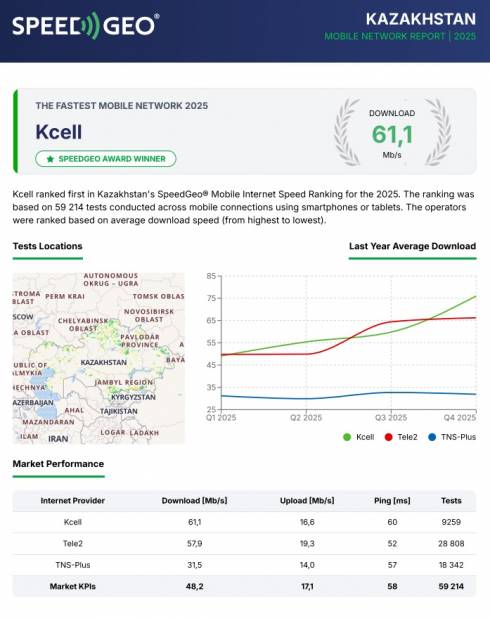 По данным отчета SpeedGeo за 2025 год, лидером по средней скорости загрузки стал оператор Kcell. В сети компании показатель download speed достиг 61,1 Мбит/с, что позволило ей занять первое место среди казахстанских операторов мобильной связи.