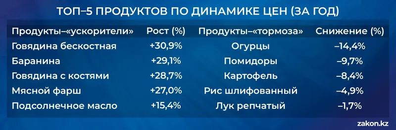Редакция Zakon.kz проанализировала свежие данные статистики и выяснила, какие продукты продолжают «кусаться», а какие позволяют казахстанцам существенно экономить.