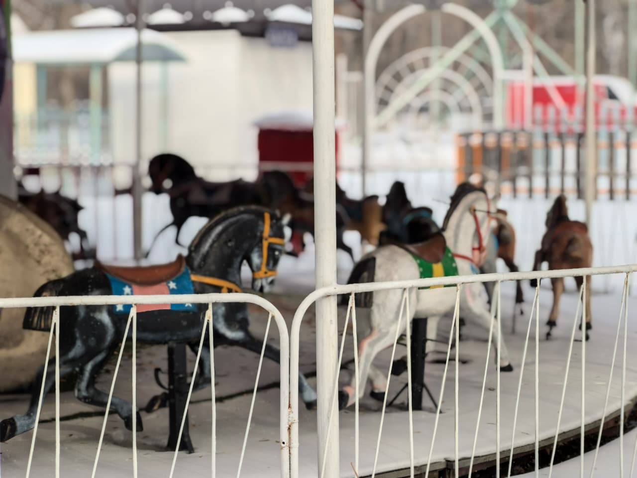 После обеда по аллеям неспешно гуляют семьи, пары, компании друзей. Кто-то останавливается, чтобы сделать фото, кто-то просто идет, любуясь тем, как зимние украшения переливаются в лучах солнца. Декорации и гирлянды словно ловят свет и отражают его в снегу, добавляя парку особого уюта, а детские карусели погрузились в сон.