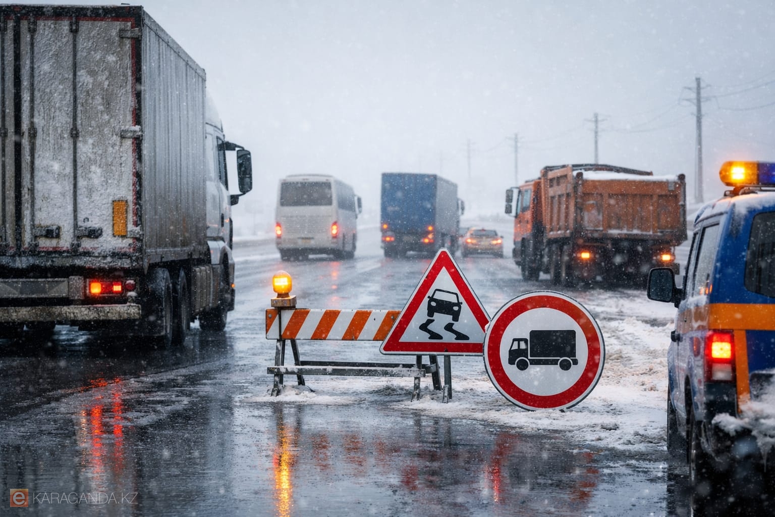 Фото: GPTchat В Карагандинской области введено временное ограничение движения для грузового и общественного транспорта на участке республиканской автодороги Астана – Караганда – Алматы. Об этом сообщает департамент по ЧС региона, передает корреспондент ekaraganda.kz.