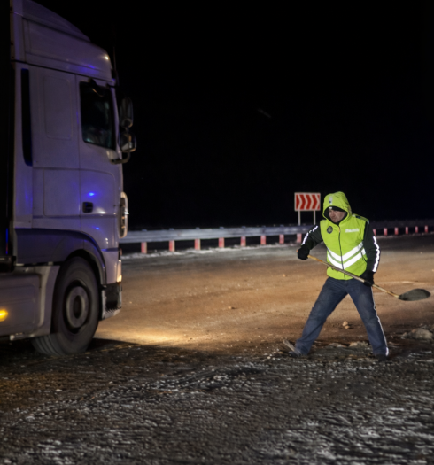 На отдельных отрезках пути движение практически останавливалось. Из-за сильного бокового ветра и гололёда тяжёлые грузовые автомобили не могли сдвинуться с места и преодолеть подъёмы. В таких условиях инспекторы самостоятельно подсыпали песчано-балластную смесь прямо под колёса большегрузов, создавая сцепление с проезжей частью. Работать приходилось на открытых участках трассы при порывистом ветре и скользком покрытии.