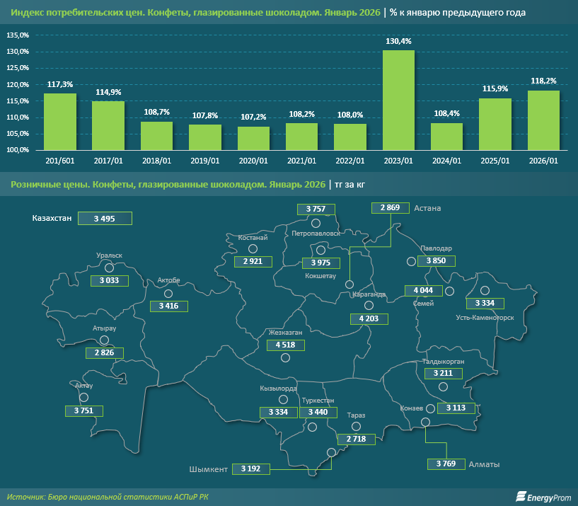 Средняя розничная стоимость килограмма глазированных шоколадом конфет в январе 2026 года составила 3,5 тыс. тг за кг, однако разброс по регионам оказался значительным.