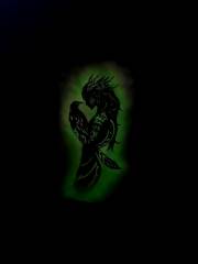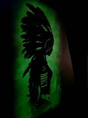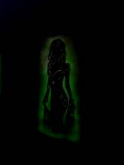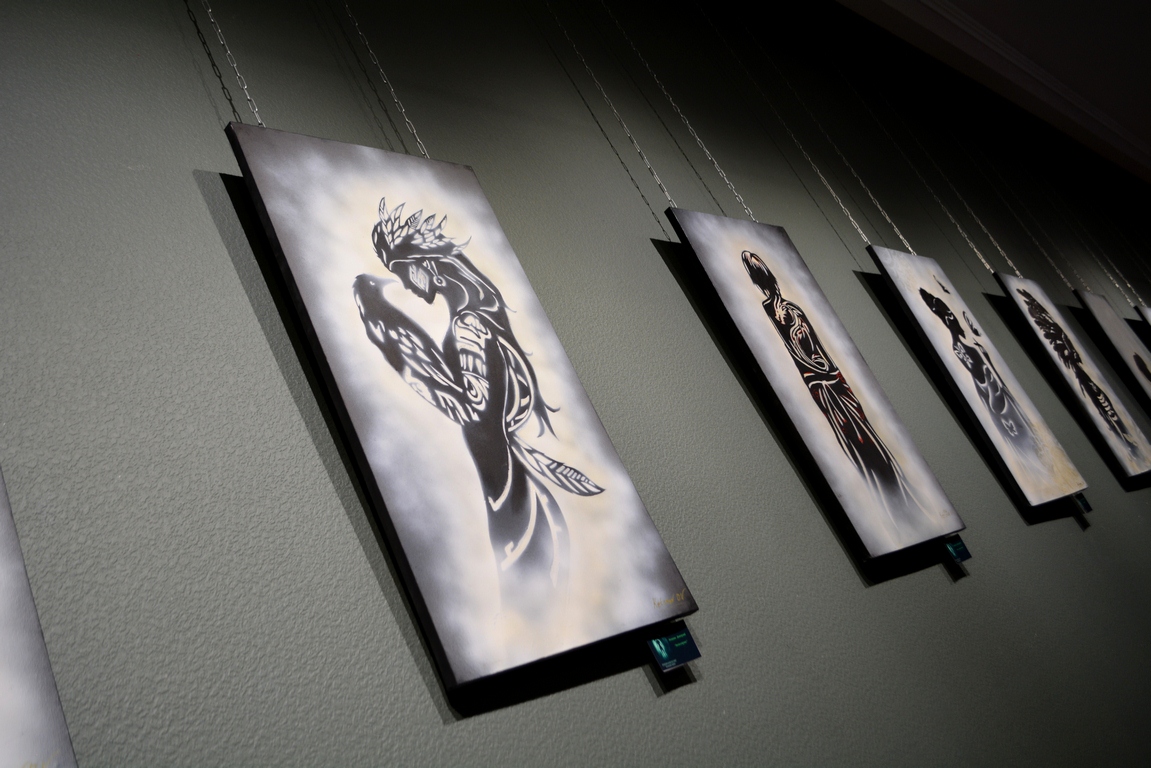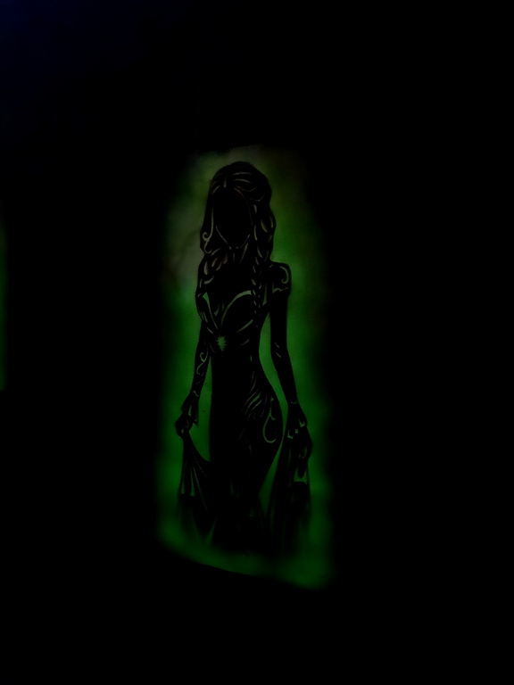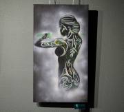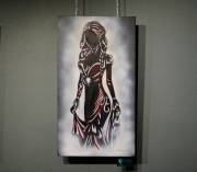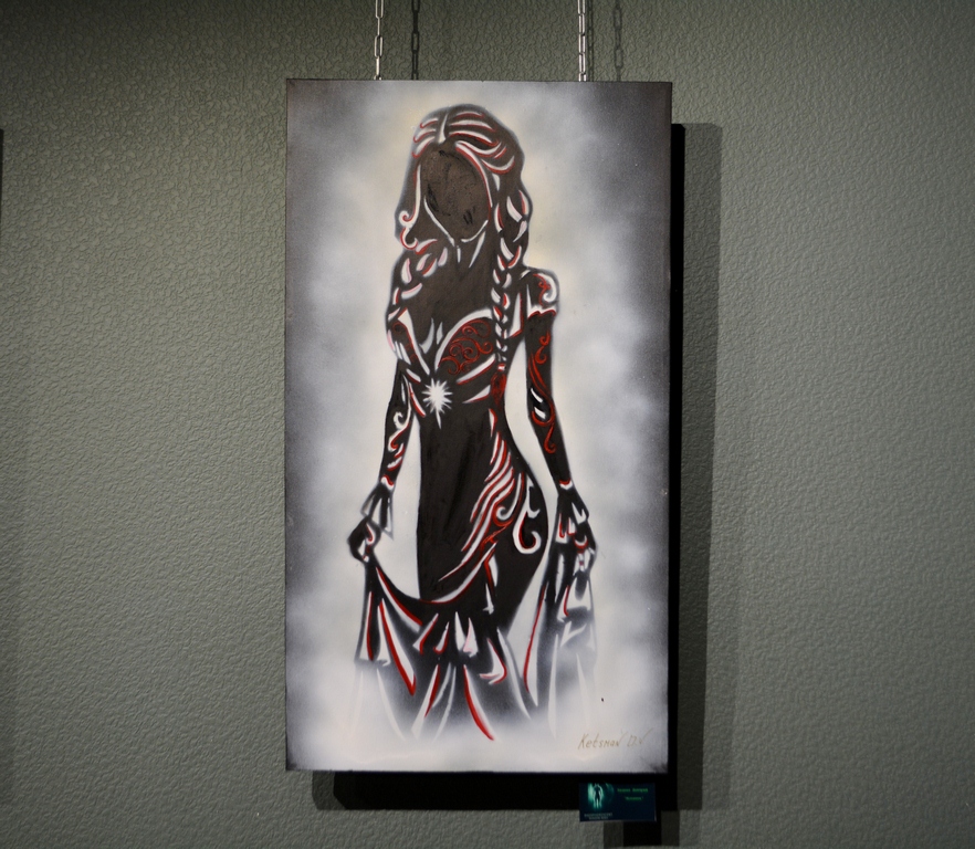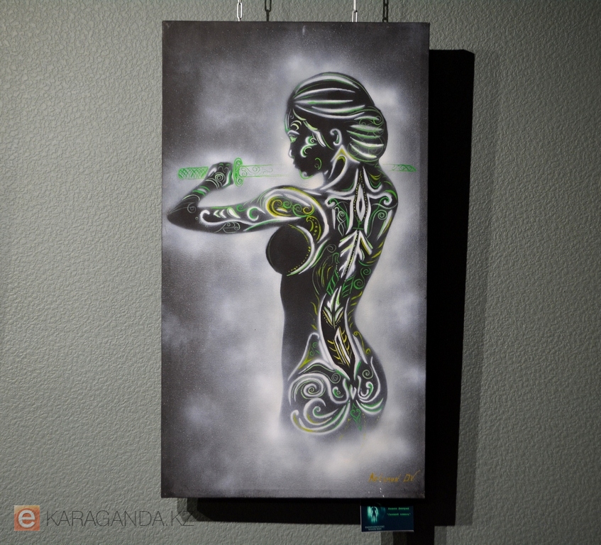 Техника phosphorescent shadow body как раз и отражает сияющие в тени силуэты. На картинах изображены фигуры женщин. Это сборные образы, вдохновлённые работами друзей-фотографов Дмитрия, а что-то подсмотрено на просторах интернета. Здесь есть и девушки-валькирии, дамы с мотыльками, с цветами. С ними соседствуют полотна в индейской, восточной, испанской тематике. Но, надо сказать, какой-то строгой общей идеей картины не объединены.