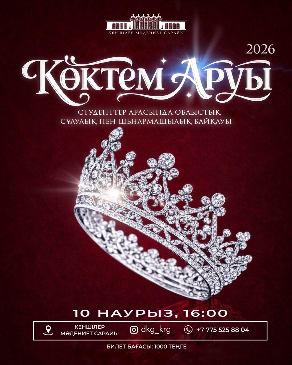 Конкурс красоты и творчества «Көктем аруы-2026» состоится 10 марта в 16:00 в главном зале ДКГ. Цена билетов – 1000 тенге.