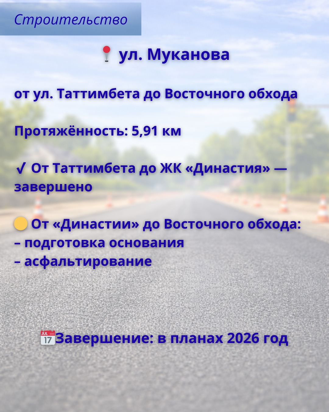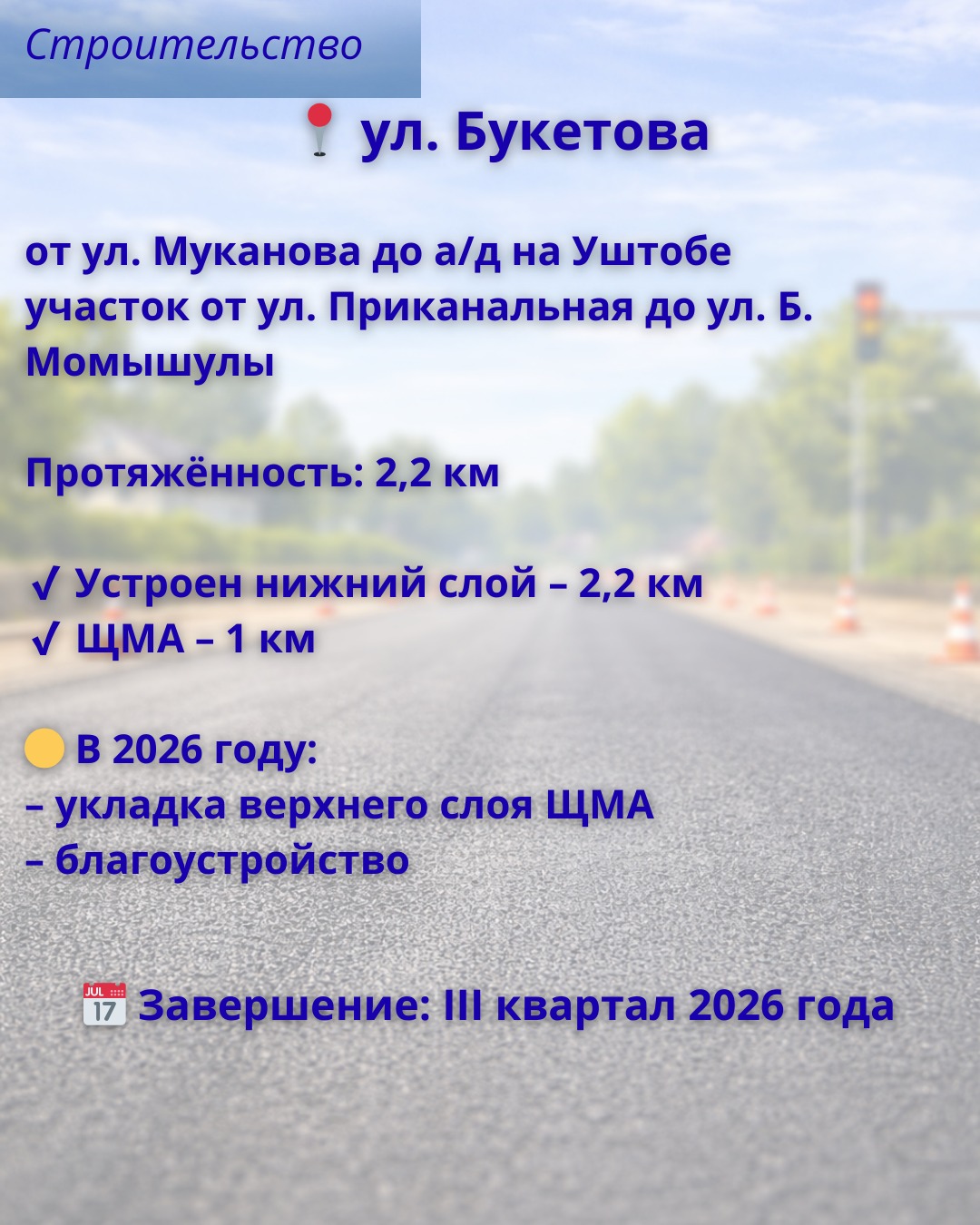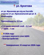 Одним из ключевых объектов остаётся дорога по улице Муканова – от Таттимбета до Восточного обхода.