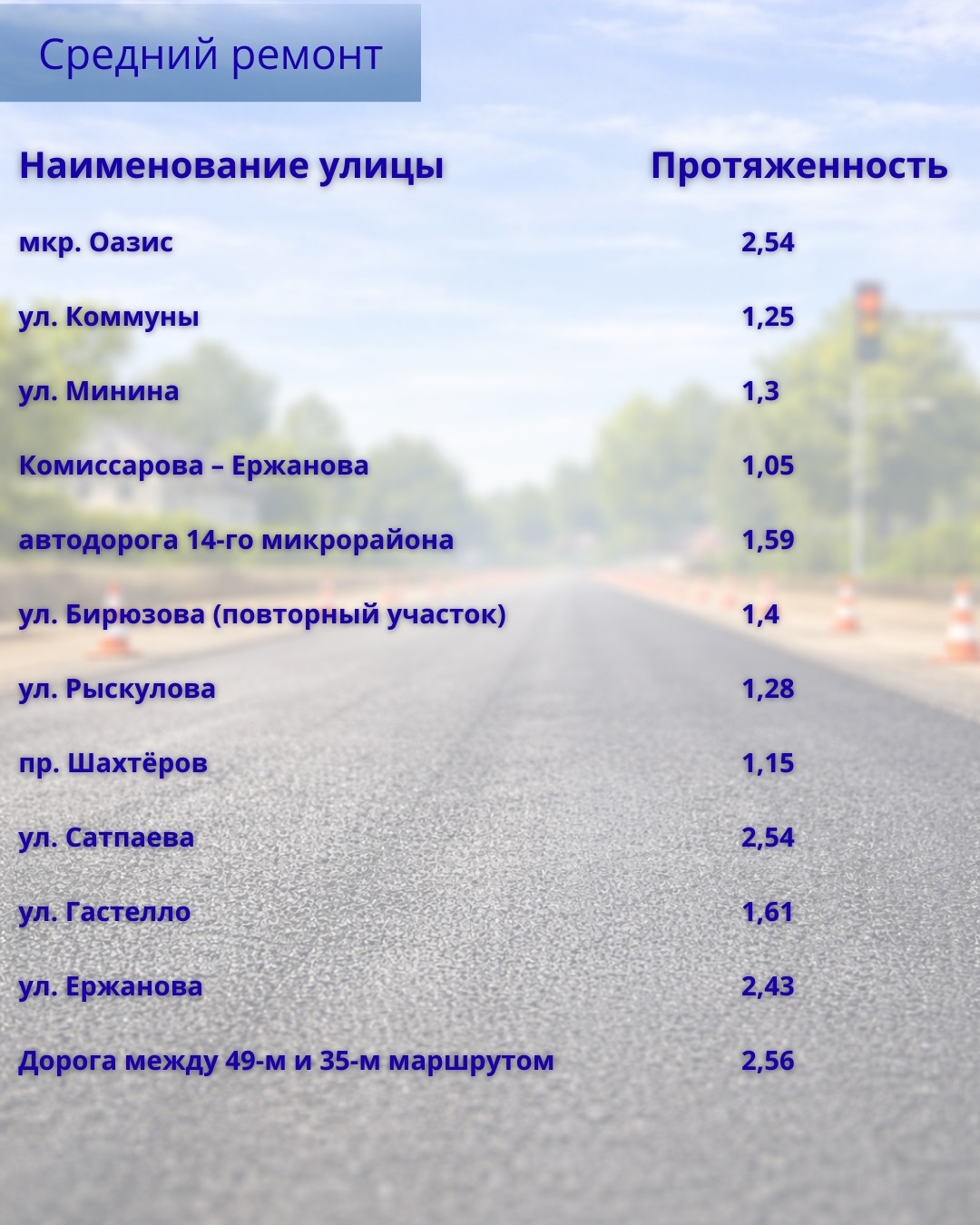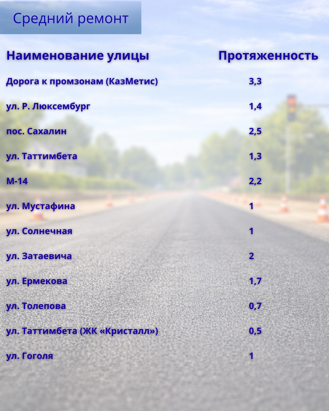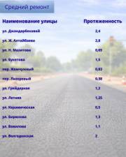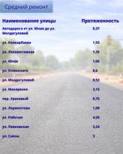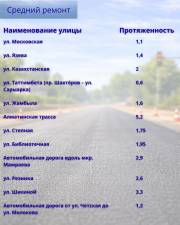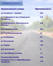 Средний ремонт предусмотрен и на ряде участков. Среди них улицы Ерубаева, Гапеева, Н. Абдирова, Сатыбалдина, Мазитова, Летняя, проспект Шахтёров, Сатпаева, Таттимбета, Язева и другие. С полным перечнем объектов можно ознакомиться в галерее к материалу.