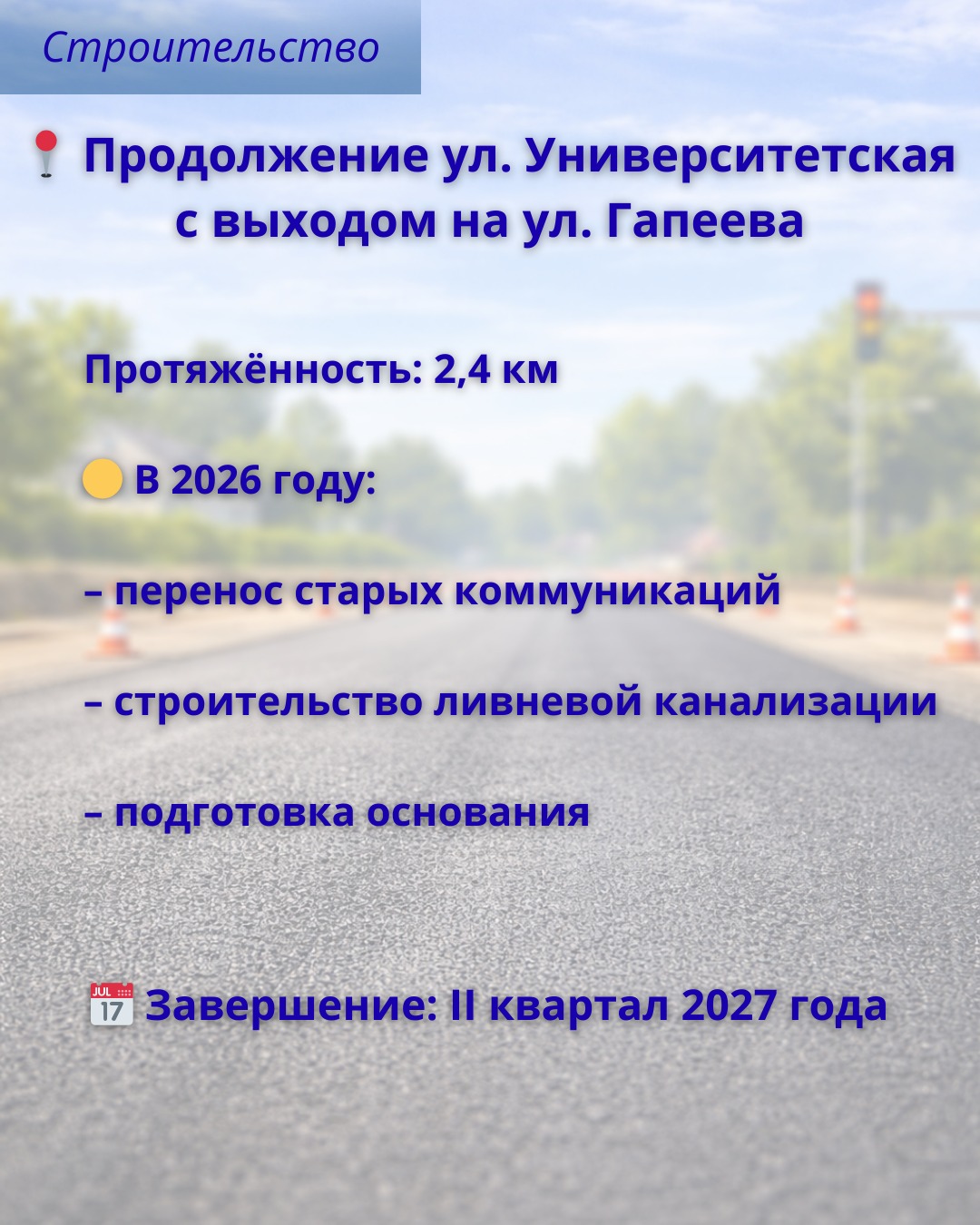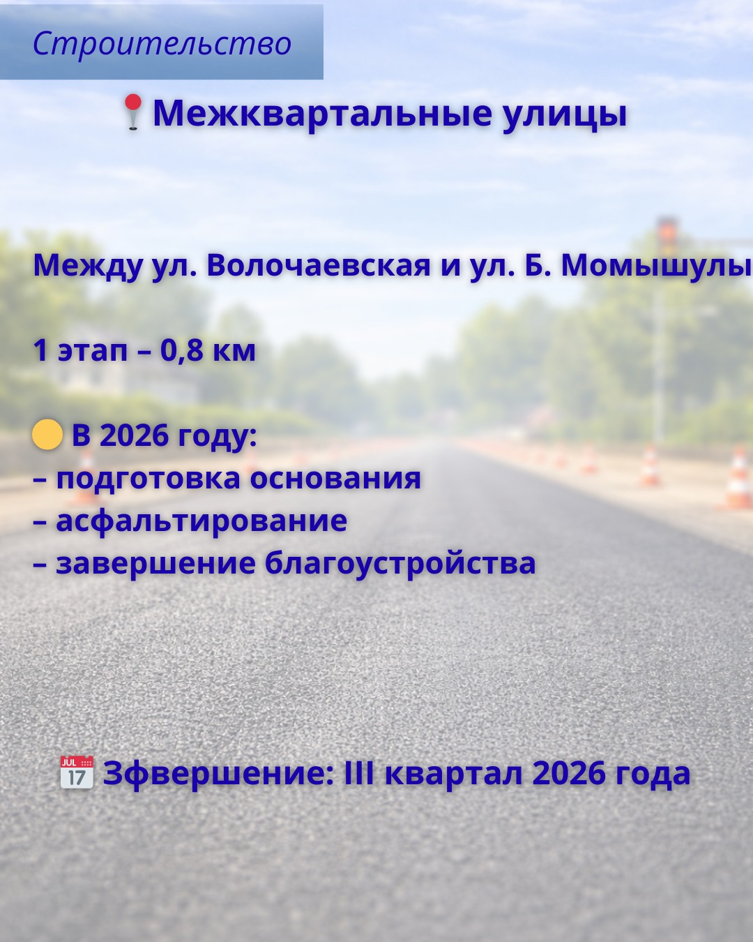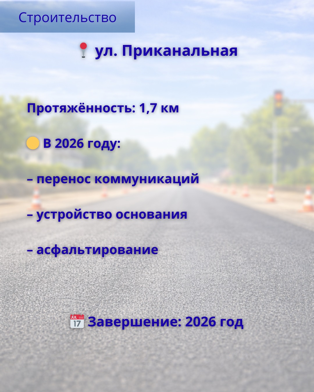 В текущем строительном сезоне работы на оставшемся отрезке будут продолжены. Также параллельно будет завершено строительство дороги на улице Приканальная.