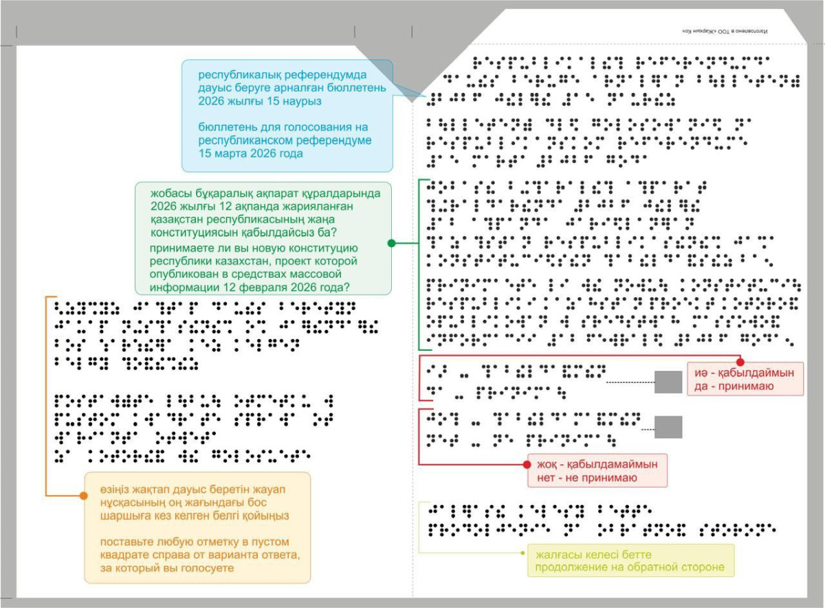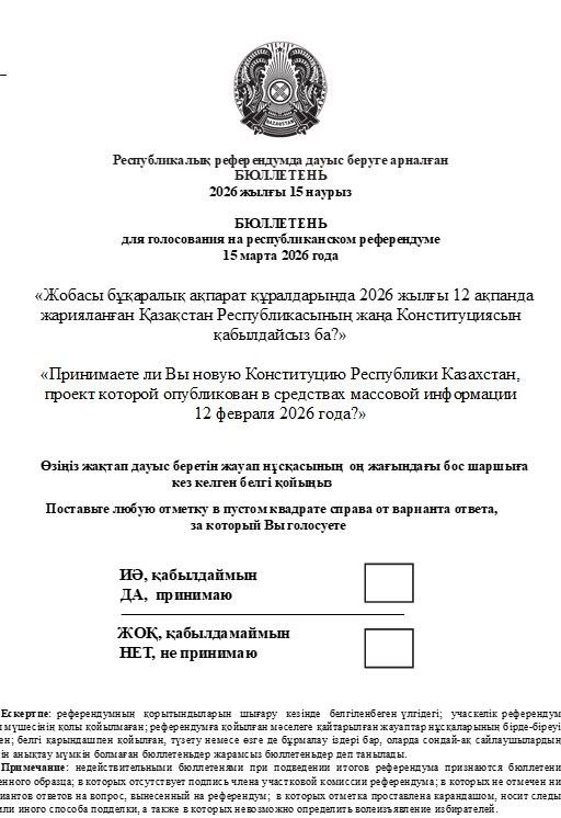 Бюллетень написан на двух языках и в нем задается только один вопрос: Принимаете ли Вы новую Конституцию Республики Казахстан, проект которой опубликован в средствах массовой информации 12 февраля 2026 года?