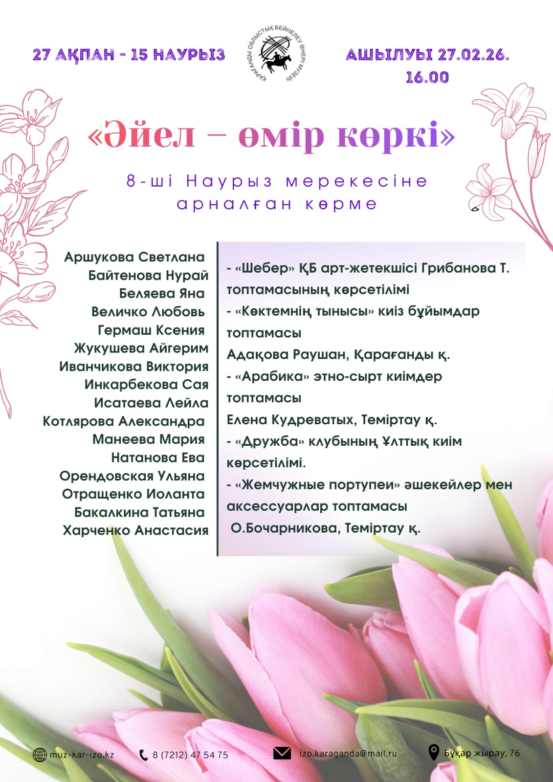 В карагандинском областном музее Изобразительного искусства (пр. Бухар жырау, 76) с 27 февраля до 15 марта будет действовать выставка «Женские истории». Здесь представят произведения художниц и мастеров разных жанров и направлений. Экспозицию, приуроченную к 8 Марта, откроют 27 февраля в 16.00, сообщает корреспондент ekaraganda.kz.