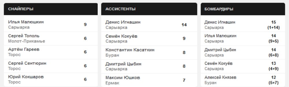 По статистике приведенной championat.com приведены лучшие игроки ВХЛ. Игроки "Сарыарки" на первый местах в каждой категории!